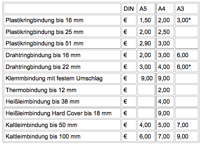 Ring- Klemm- und Thermobindungen bei geringen Mengen sofort zum Mitnehmen. Die Heißleimbindung wird in ein bis zwei Stunden, die Kaltleimbindung wird bis zum Mittag des nächsten Tages angefertigt.